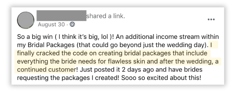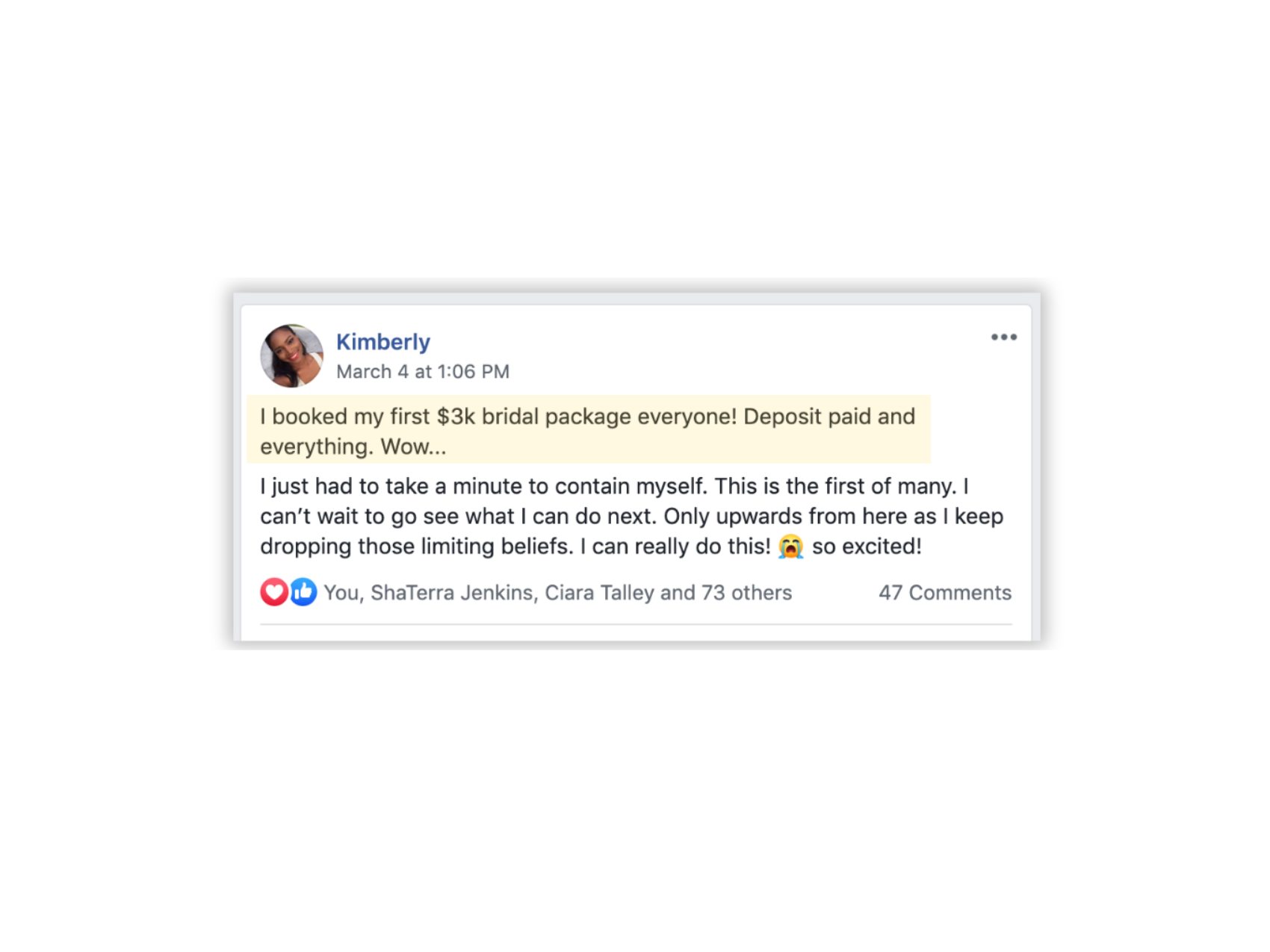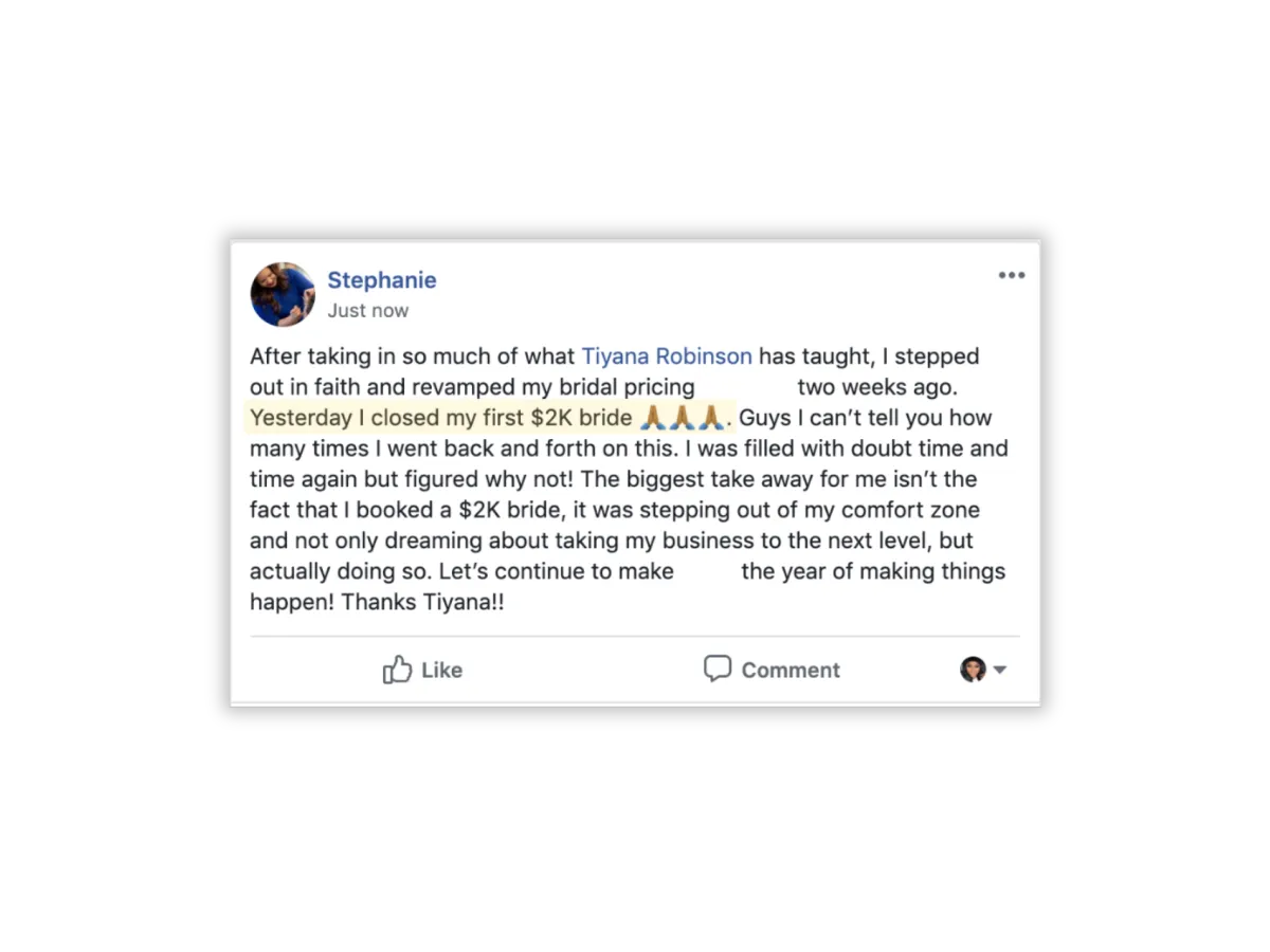 Instead of charging per service, I started looking at the full scope of each wedding… and built my offers around that. That’s when I started booking $1,000+ weddings consistently.