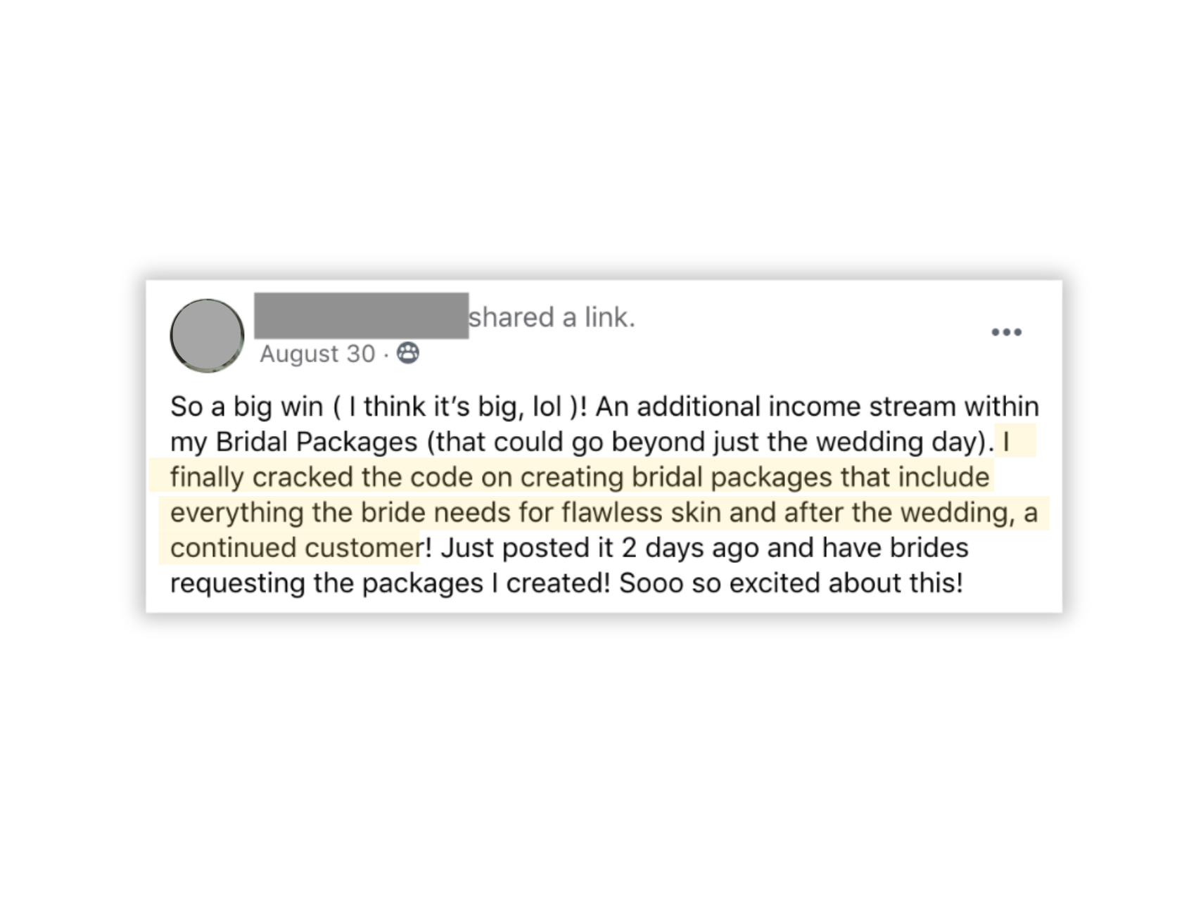 Once I created those results for myself, it led me to develop the $1,000 Bride Model — a system I’ve now taught for over a decade to help bridal artists structure their bookings in a way that leads to higher-value weddings.